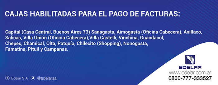 Info-General Inicio Provinciales EDELAR S.A. La distribuidora de energía eléctrica de La Rioja informó sus canales de cobro y líneas de cajas habilitadas.