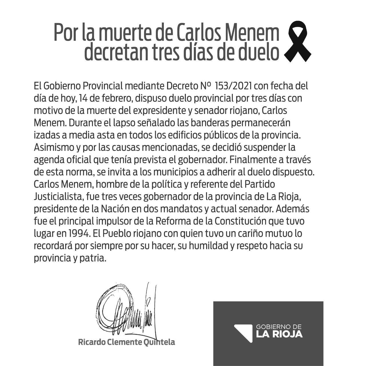 El Gobierno de la República Argentina y el Gobierno de La Rioja, decidió por la muerte de Carlos Menem, duelo por tres días. Rio Tercero no Adhiere