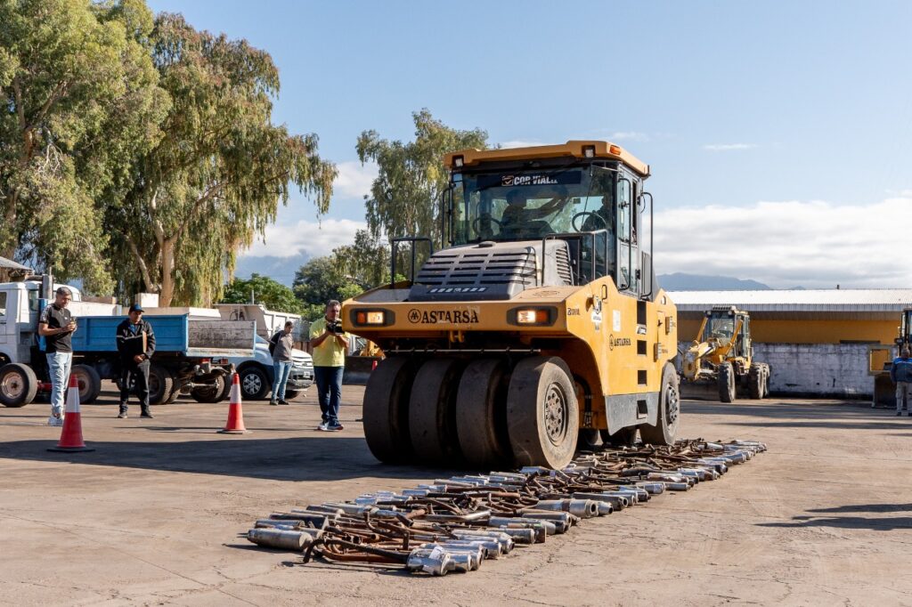 Tras el decomiso realizado en los operativos, en el parque automotor se procedió a la destrucción de los caños de escapes ruidos por parte del personal de dirección de Tránsito Municipal.