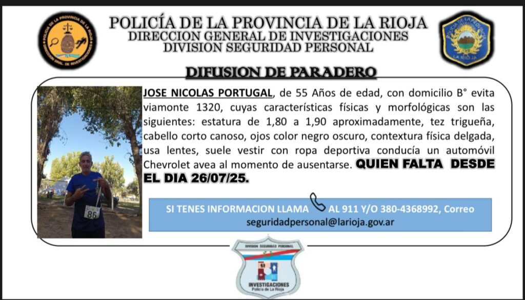 La Rioja, 28 de julio de 2025 – La comunidad riojana se encuentra en vilo ante la desaparición de José Nicolás Portugal, un conocido atleta y militante, apodado cariñosamente por sus amigos como “Josho Tipila”. Desde el pasado sábado, se perdió todo rastro de su paradero, generando una creciente preocupación entre familiares, amigos y la comunidad deportiva.