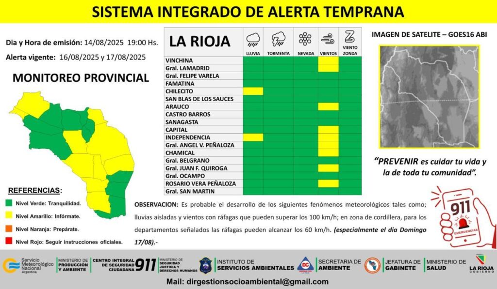 El alerta por vientos incluye a los departamentos de Vinchina, General Lamadrid, Arauco, Capital, Independencia, General Ángel Vicente Peñaloza, Chamical, General Juan Facundo Quiroga y Rosario Vera Peñaloza.