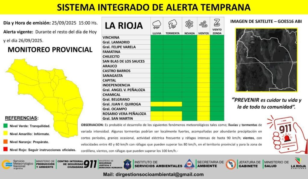 El Comité Operativo de Emergencias a través del Sistema Integrado de Alerta Temprana emitió en la tarde del jueves un alerta amarillo por fuertes vientos, y probables lluvias y tormentas durante el resto del día de hoy y el viernes 26 de septiembre en la provincia de La Rioja.