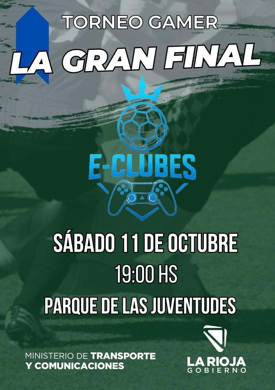 El Ministerio de Transporte y Comunicaciones del Gobierno de La Rioja realizará este sábado 11 de octubre, desde las 19 horas, la Gran Final del Torneo “E-Clubes” en el Parque de las Juventudes. La jornada combinará deporte, gaming y tecnología en un encuentro abierto para toda la comunidad.