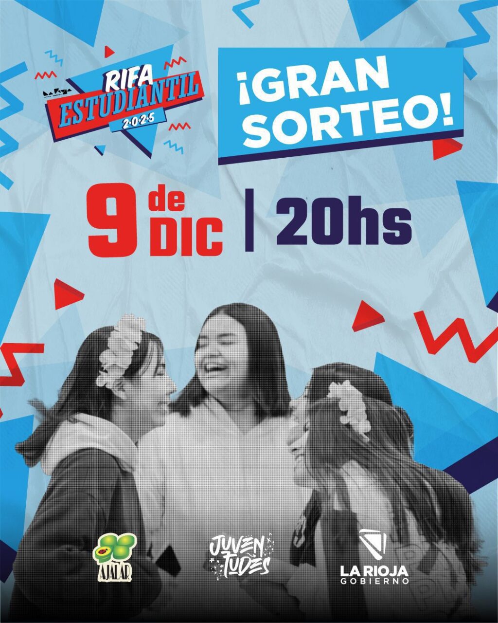 La Secretaría de Juventudes de La Rioja llevará a cabo el Gran Sorteo de la Rifa Estudiantil este martes 9 de diciembre a las 20 horas. El evento será transmitido en vivo por AJALAR y a través de las redes sociales oficiales del organismo.