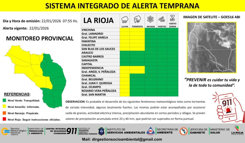 El Sistema Integrado de Alerta Temprana informó sobre la vigencia de una alerta por fenómenos meteorológicos que afectarán a gran parte del territorio riojano hasta el viernes 22 de enero. El reporte advierte sobre el probable desarrollo de tormentas de variada intensidad, algunas de las cuales podrían ser localmente fuertes.