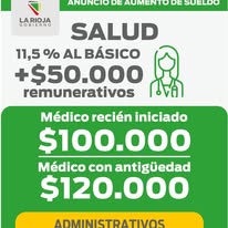 Salud: El sector percibirá un 11,5 % al básico más 50.000 pesos remunerativos. Las mejoras parten de los 100.000 pesos para médicos ingresantes y superan los 120.000 pesos para agentes con antigüedad. El personal administrativo tiene garantizado un piso de 75.000 pesos.