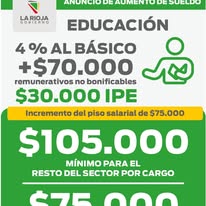 Educación: Se otorgará un 4 % al básico más 70.000 pesos remunerativos. Sumando el incremento del piso salarial y los 30.000 pesos destinados al IPE, un docente frente al aula recibirá aproximadamente 105.000 pesos extra por cargo.