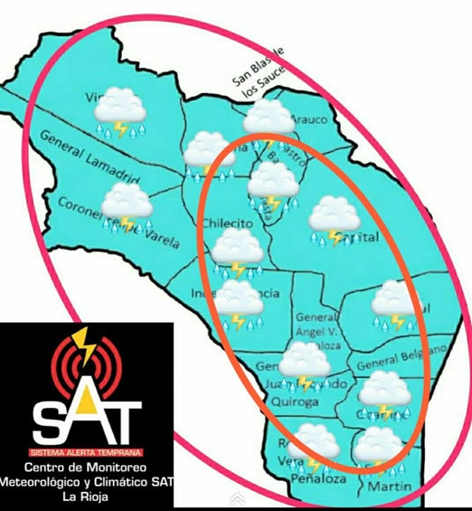 Los departamentos Rosario Vera Peñaloza, General San Martín, General Belgrano, General Ocampo, General Juan Facundo Quiroga, General Ángel V. Peñaloza y Chamical se encuentran bajo alerta por el desarrollo de tormentas que comenzarán este lunes por la noche y persistirán durante la madrugada del martes. Algunas podrían ser localmente fuertes, con probabilidad de lluvias intensas, tormentas eléctricas, ocasional caída de granizo y ráfagas de viento.